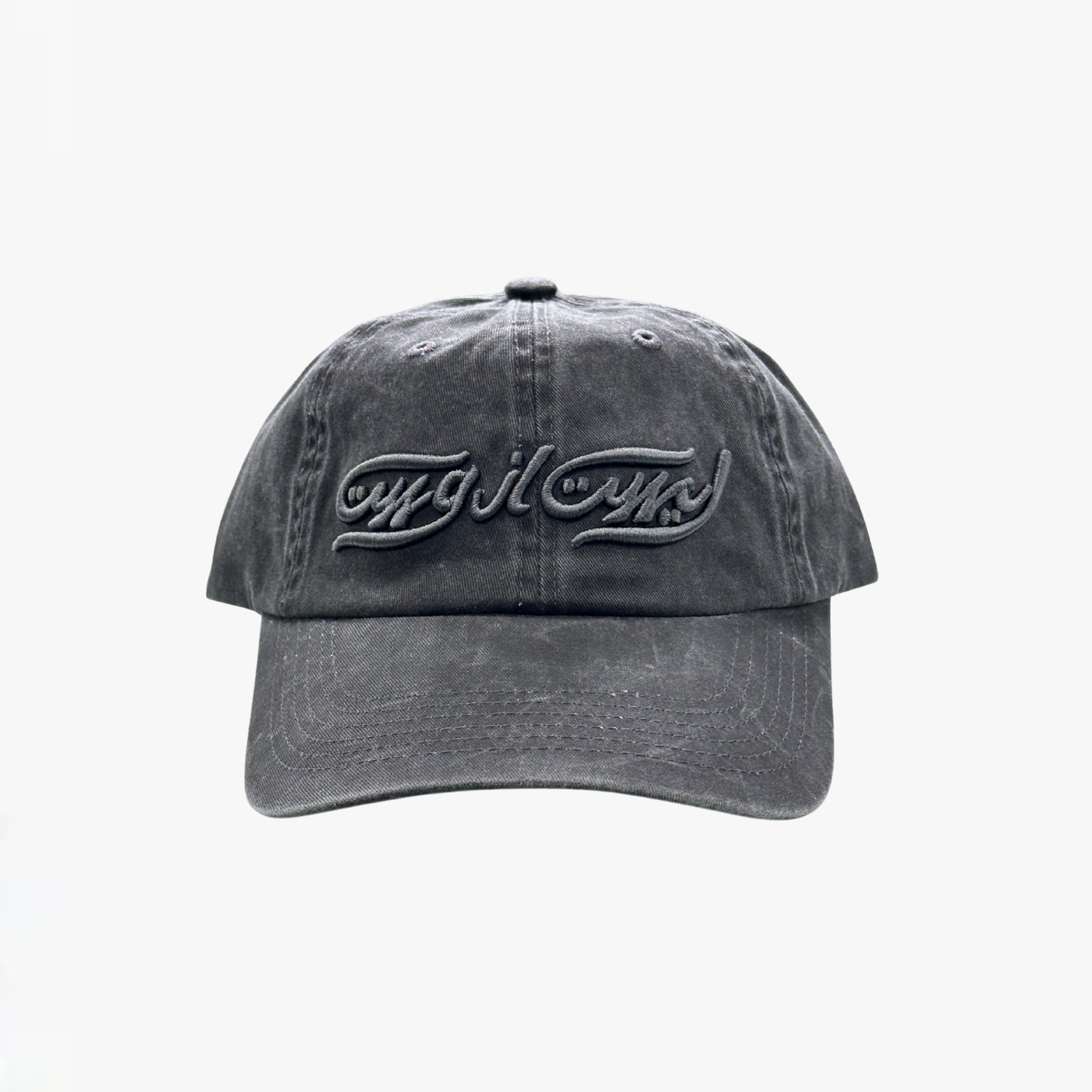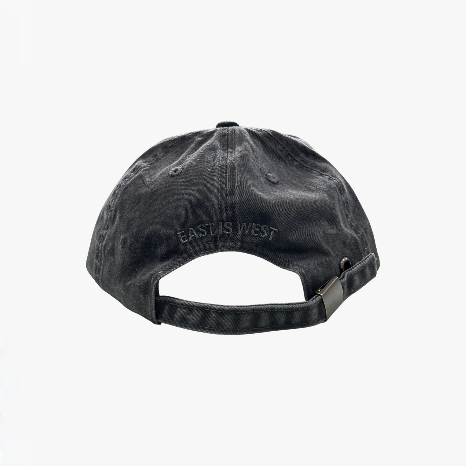 Washed cotton hat with topstitching in raised East is West signature Persian-Arabic script. East is West in English is embroidered on the back.